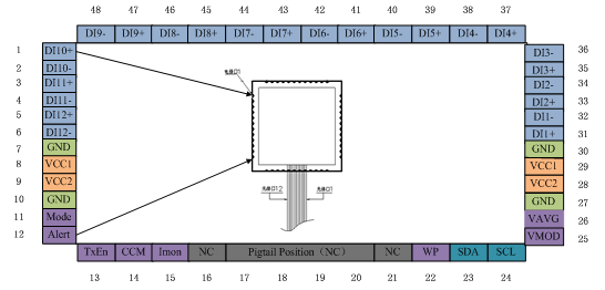 | F-tone LCC48 12路并行发射光模块,6.25G每通道,A类管脚图 | 空 商业级 | 100mm尾纤长度(可定制) | MT MT尾纤输出MP MPO尾纤输出 | GC:全国产空:非全国产 |