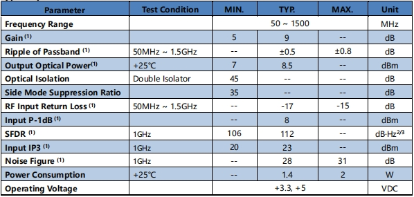 Note(1):Test with F-tone Networks Optical Recriver and 1.0-meter SMF-28 fiber.Host system or chassis may degrade performance.