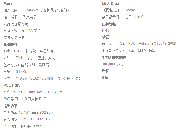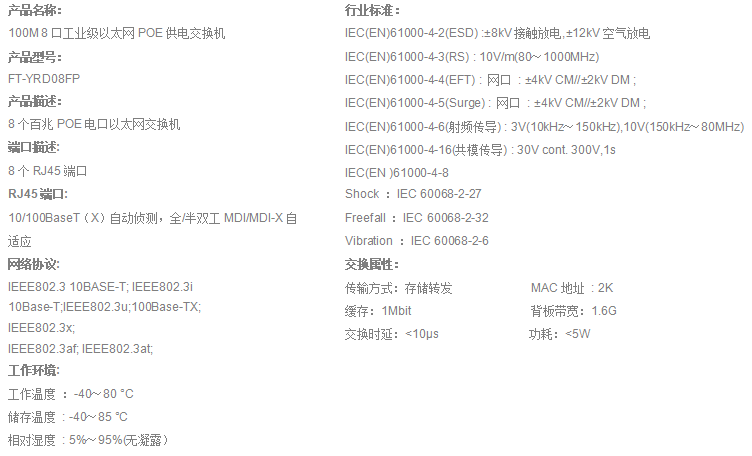| FT-YRD08FP | 8口百兆以太网POE供电交换机、导轨式、DC48-57V供电-宽温(-40℃-80℃)-CE-RoHS-FCC-公安部检验报告 -工信部入网许可证 | |
