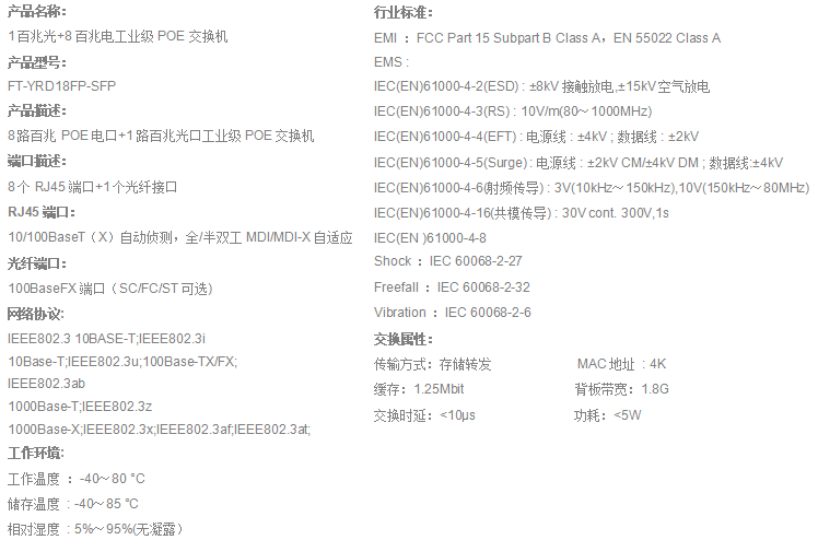 FT-YRD18FP-SC201个百兆光+8个百兆电、SC口、单模双纤、20公里、带POE功能、导轨式、DC48-57V供电-宽温(-40℃-80℃)-CE-RoHS-FCC-公安部检验报告-工信部入网许可证