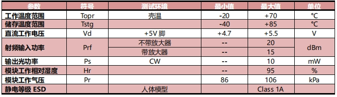 注意:超过最大(最小)值,将会有可能造成光模块永久损坏或缩短模块使用寿命和模块不能质保。