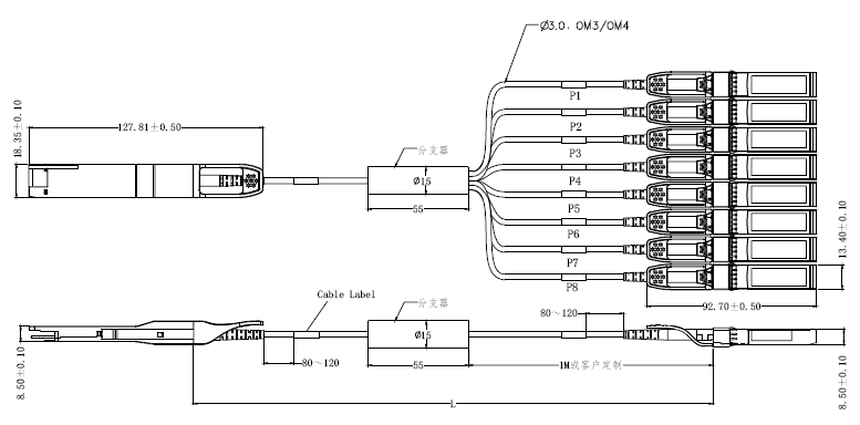| FTQD-4H-8CS-Oxxx | 400G QSFP56 DD to 8x53G SFP56 AOC, 70m on OM3 Multimode Fiber (MMF)and 100m on OM4 MMF,0ºC ~ +70ºC |