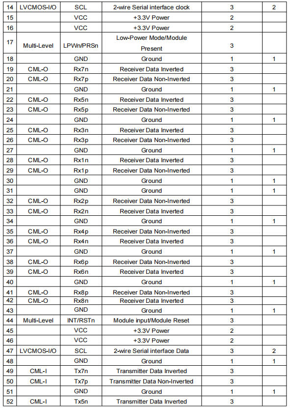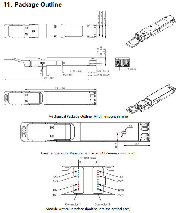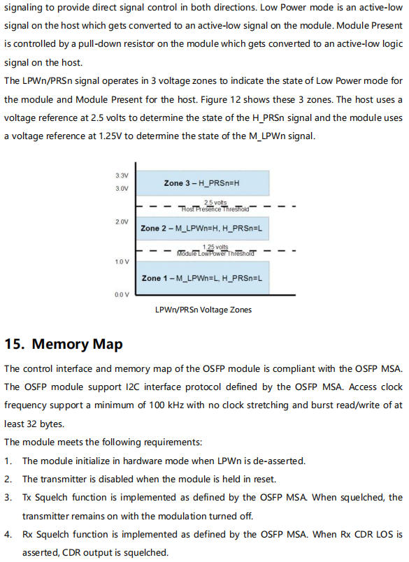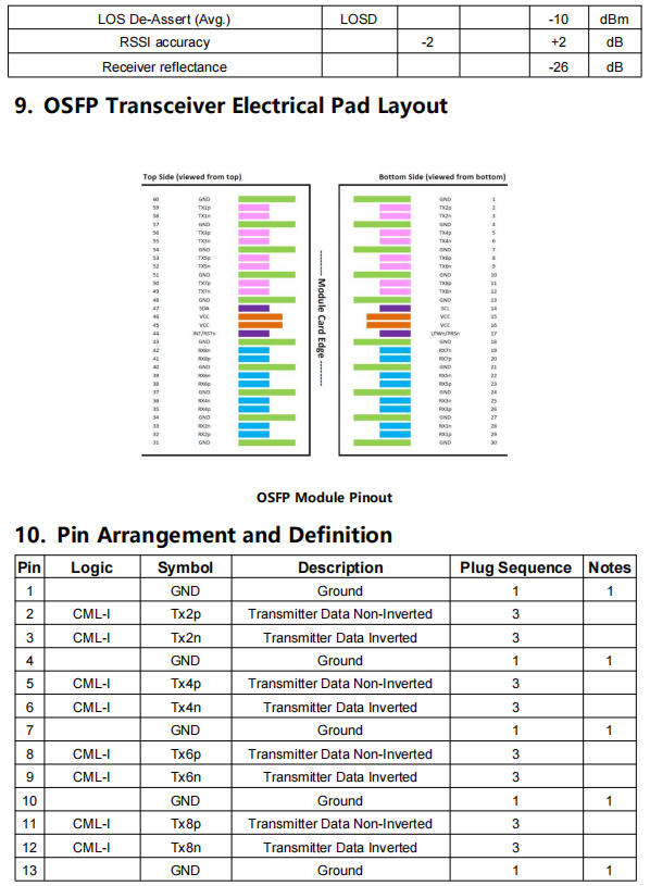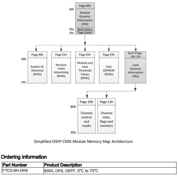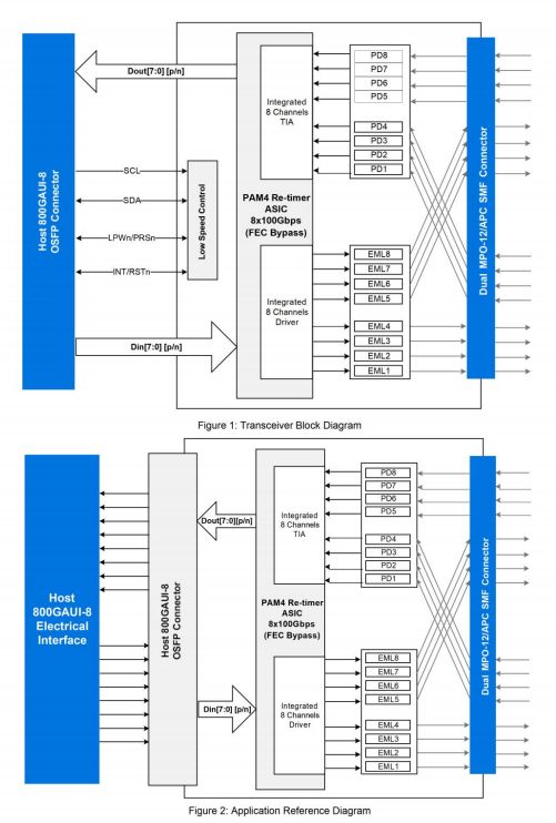 The OSFP transceiver module is designed for use in 800 Gigabit Ethernet links over 500m single mode fiber. The module has 8 independent electrical input/output channels operating up to 106.25Gbps per channel. This transceiver consists of two transmitter/receiver units, with each operating on a set of wavelengths on the ITU G.694.2 CWDM at 1310nm. The transmitter path of the module incorporates a bi-directional PAM4 re-timer ASIC integrated with EML laser and 8-channel internal driver. On the receiver path, used 8 photodiodes and integrated TIA, along with the PAM4 re-timer. The electrical interface of the module is compliant with the 800GAUI-8 interface as defined by IEEE 802.3ck, and compliant with OSFP MSA.